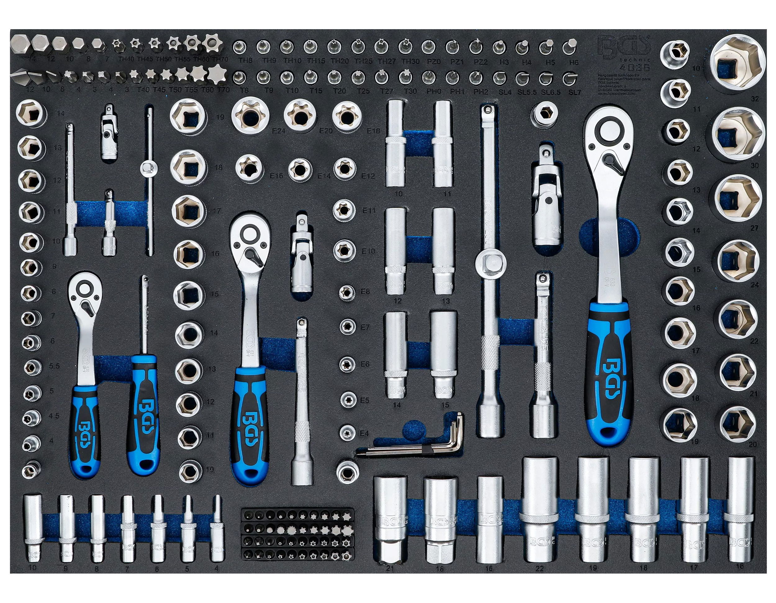 BGS Technic 9-4036 1/4", 3/8", 1/2"-os dugókulcs, rátűzőkulcs és bitkészlet, 192 részes